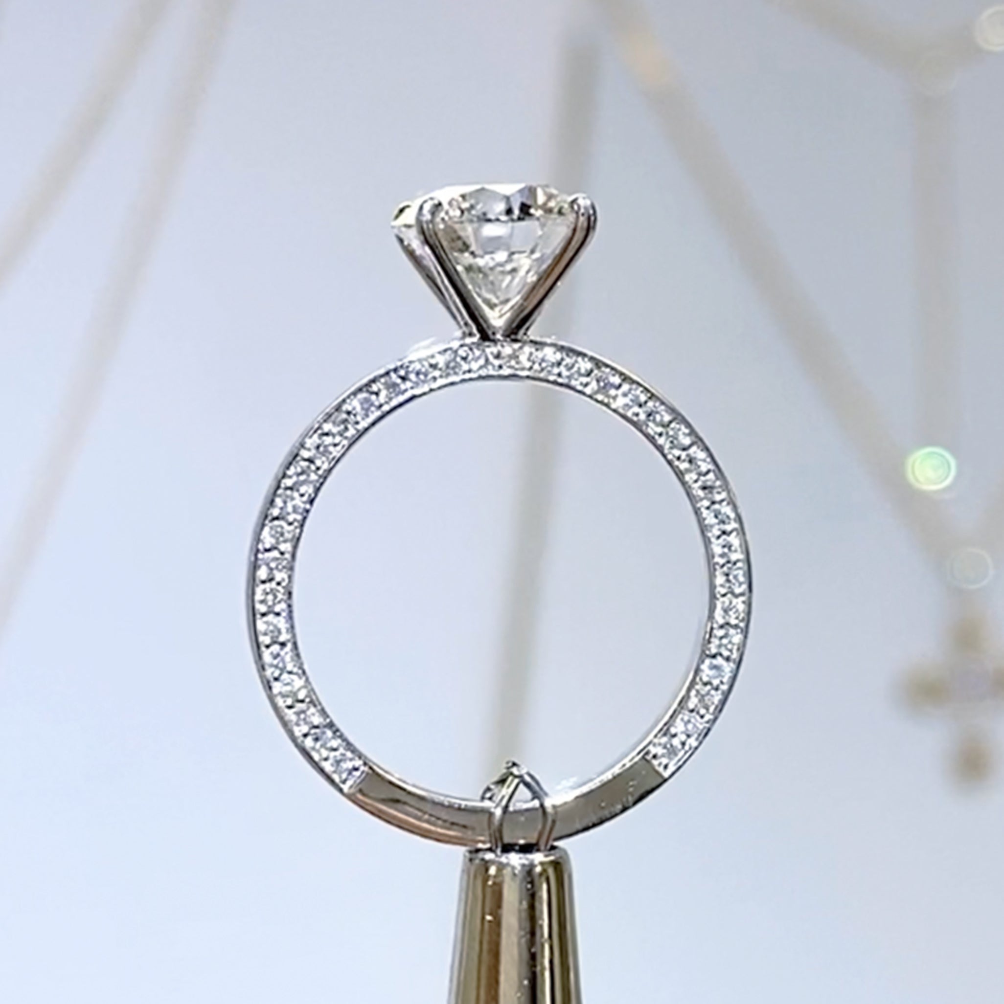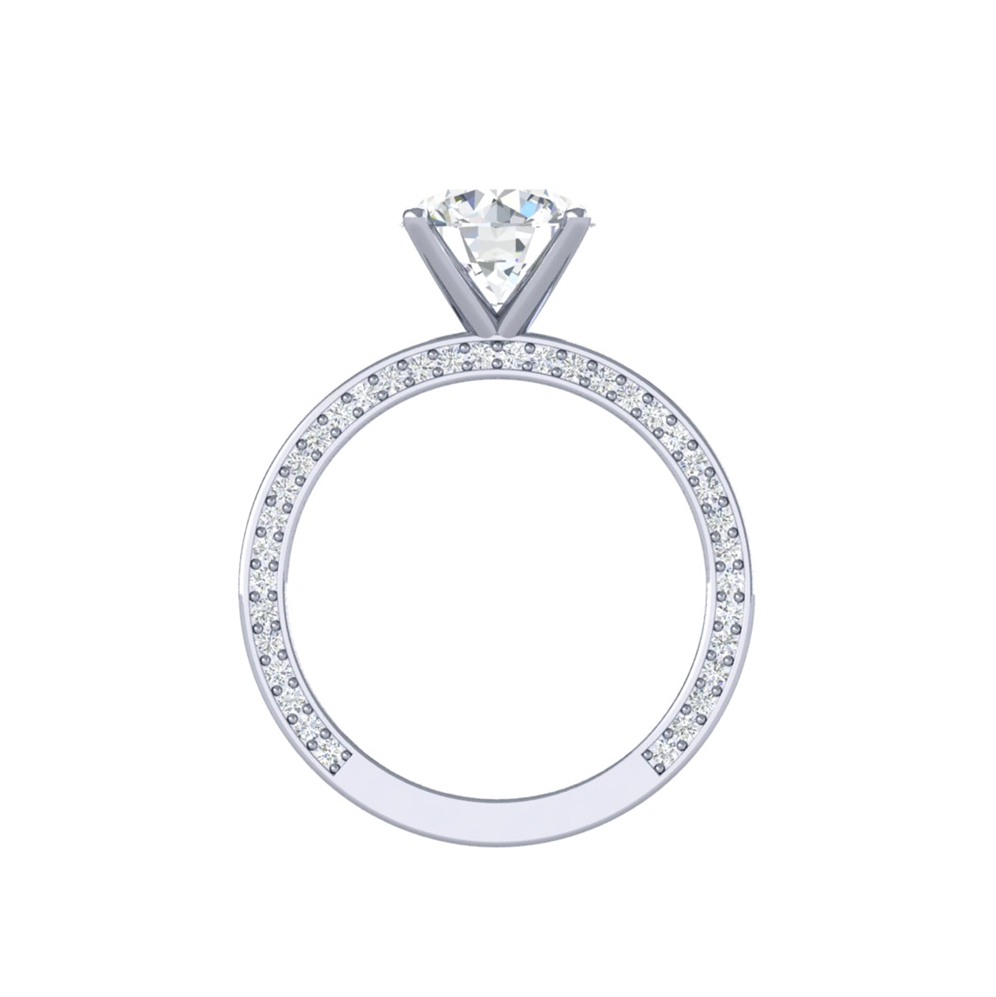 A classic round brilliant diamond solitaire from the front with a hidden diamond feature that can be seen from the sides.