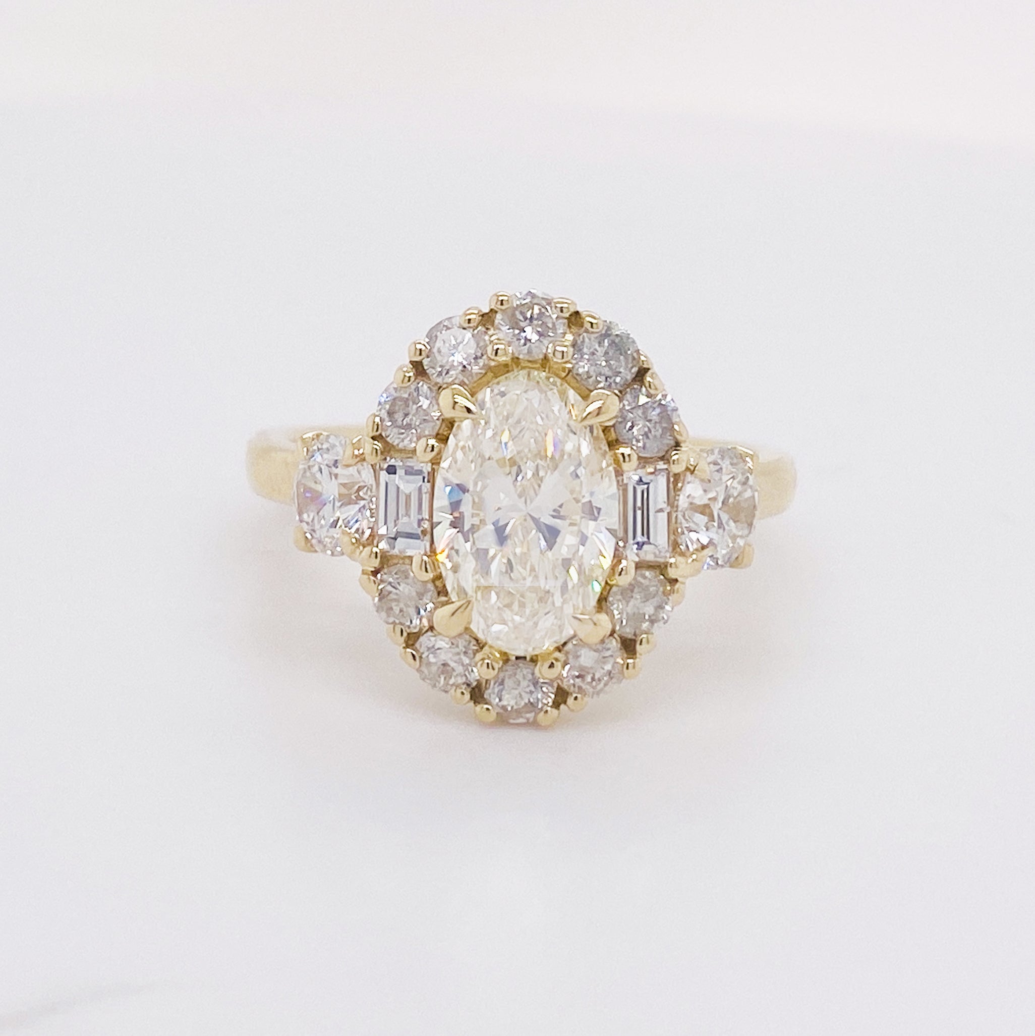 Oval diamond three stone ring with a one-of-a-kind diamond halo made from family heirloom jewelry.