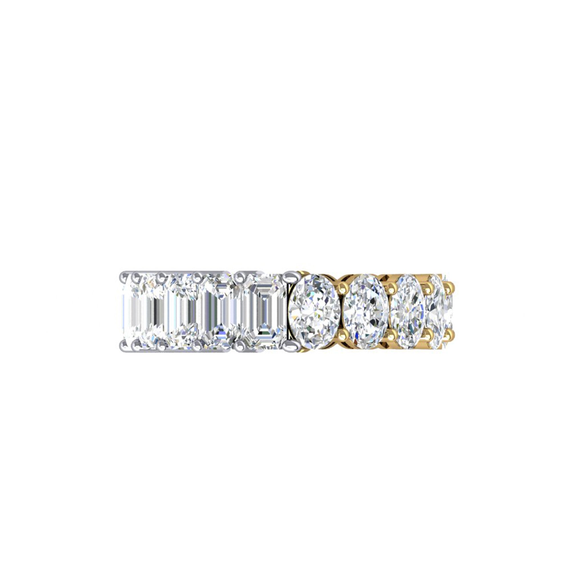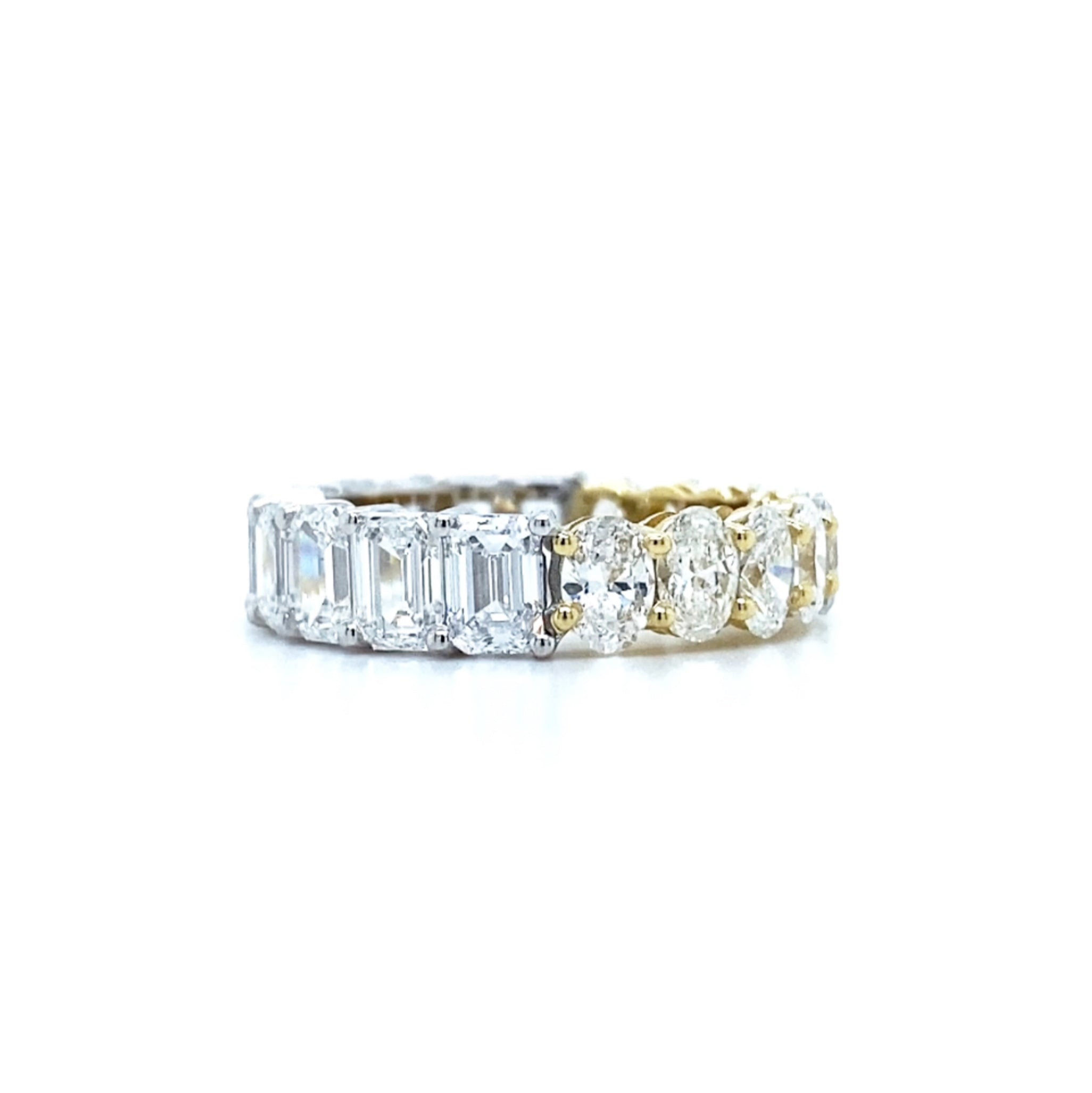 One eternity band with an emerald diamond, white gold side and an oval diamond yellow gold side.