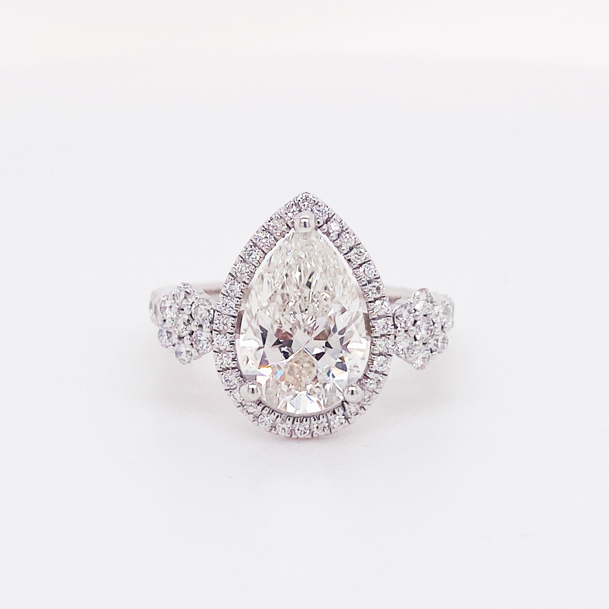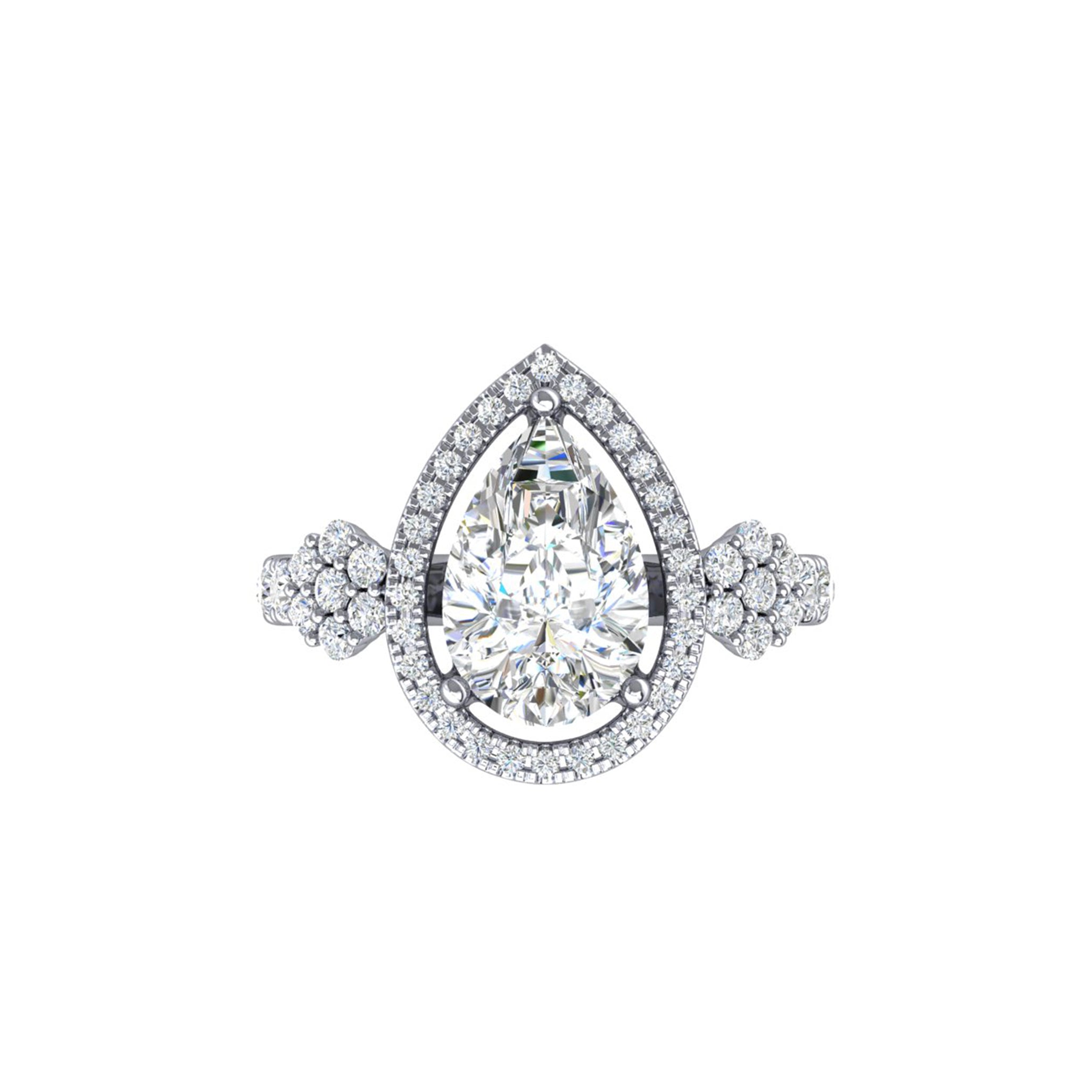 A three-stone inspired design using round brilliant diamond clusters on the side of a pear shape diamond halo.