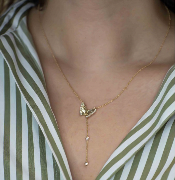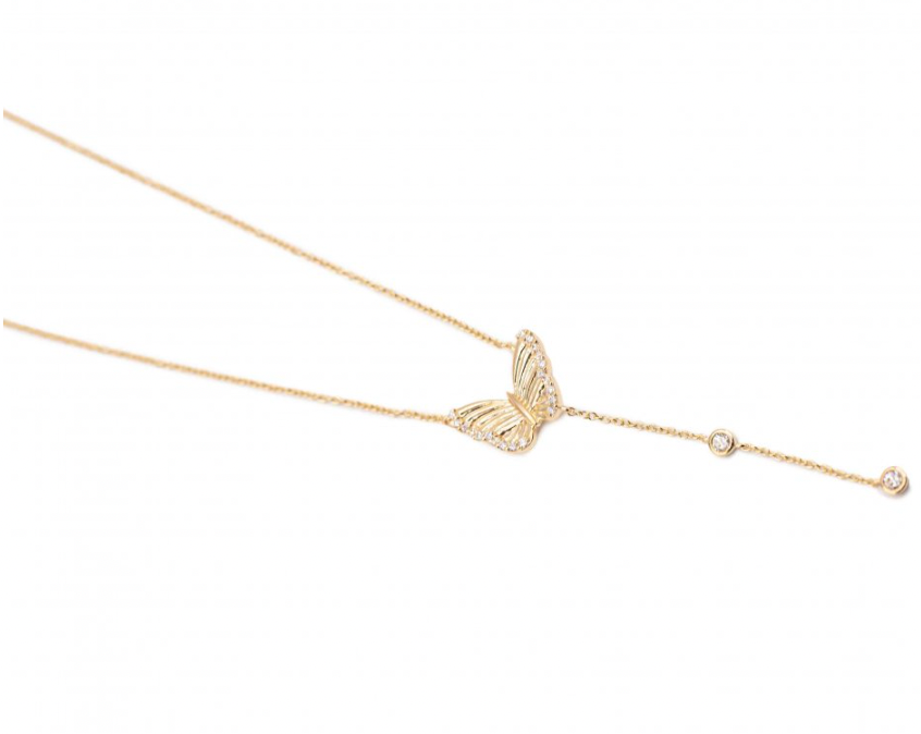 14k Butterfly Lariat Necklace with Diamond Bezel Drops 18"
