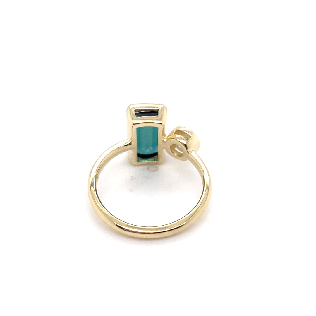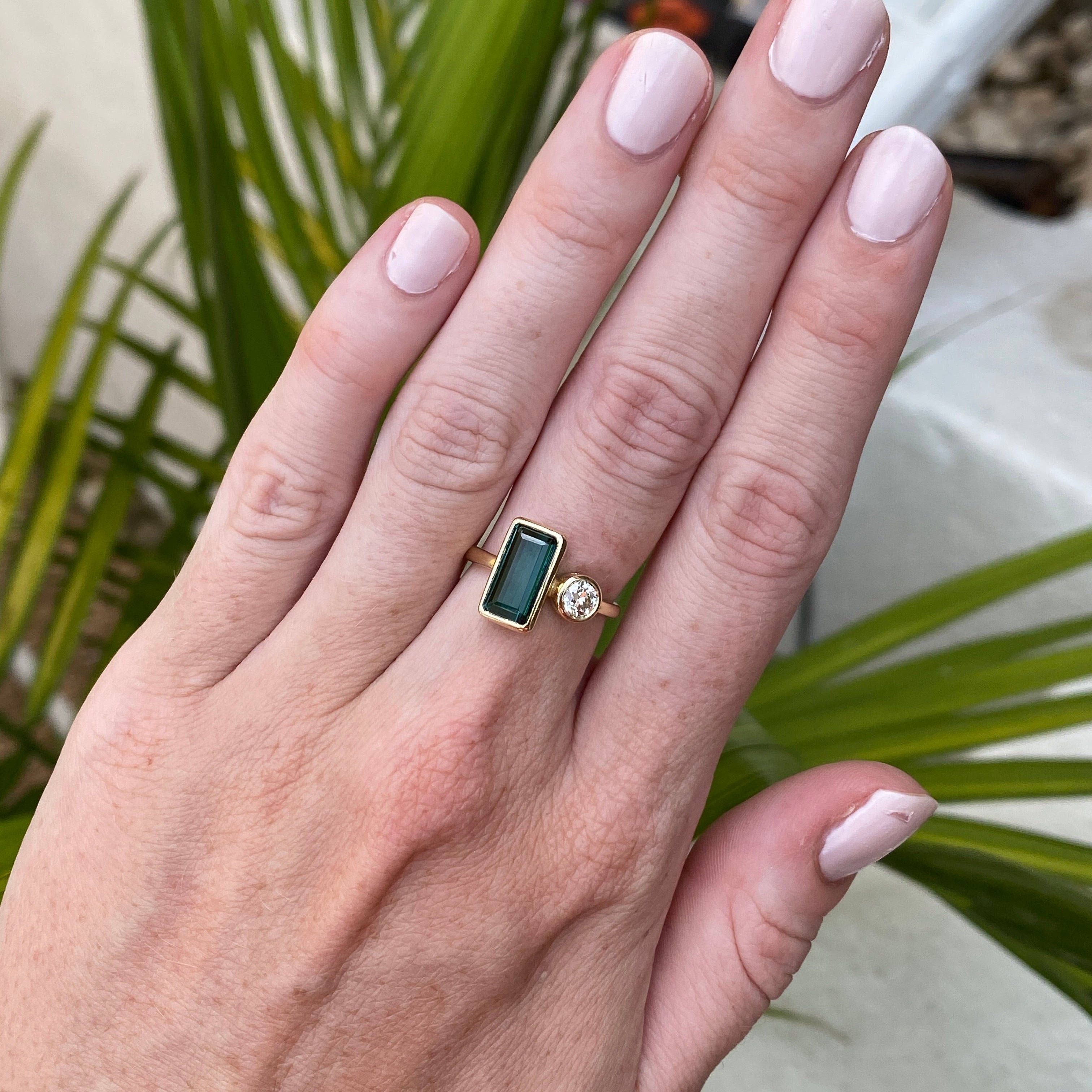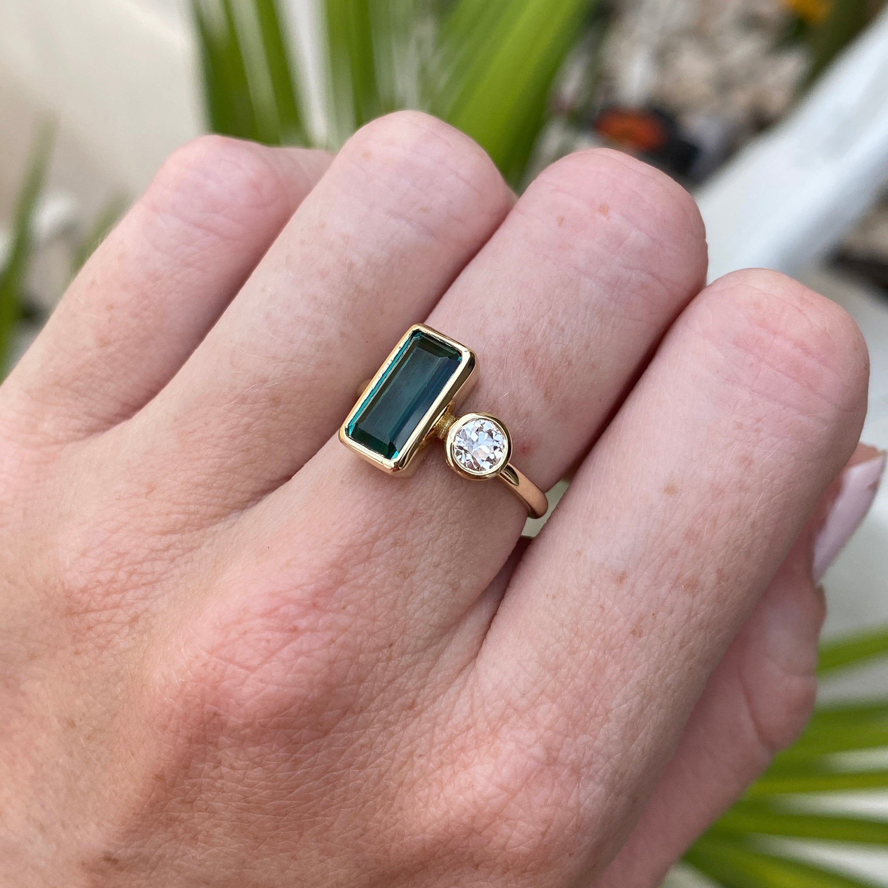 Wear on its own or add a curved ring to make a statement! Tourmalines are making a statement in our Marigold Collection. Featuring a vibrant bezel set 2.14-carat green tourmaline, this ring captures the beauty of nature in its purest form. The green tourmaline is accented with a 0.37 carat Old European Cut diamond, adding just the right touch of brilliance and contrast. The ring is a size 6 and can be sized up or down by 2 sizes.