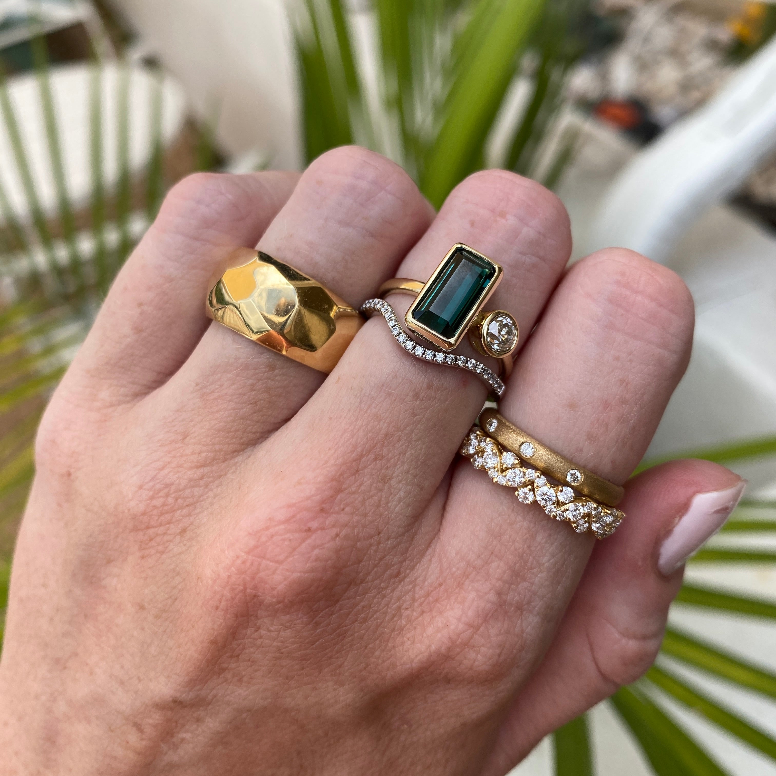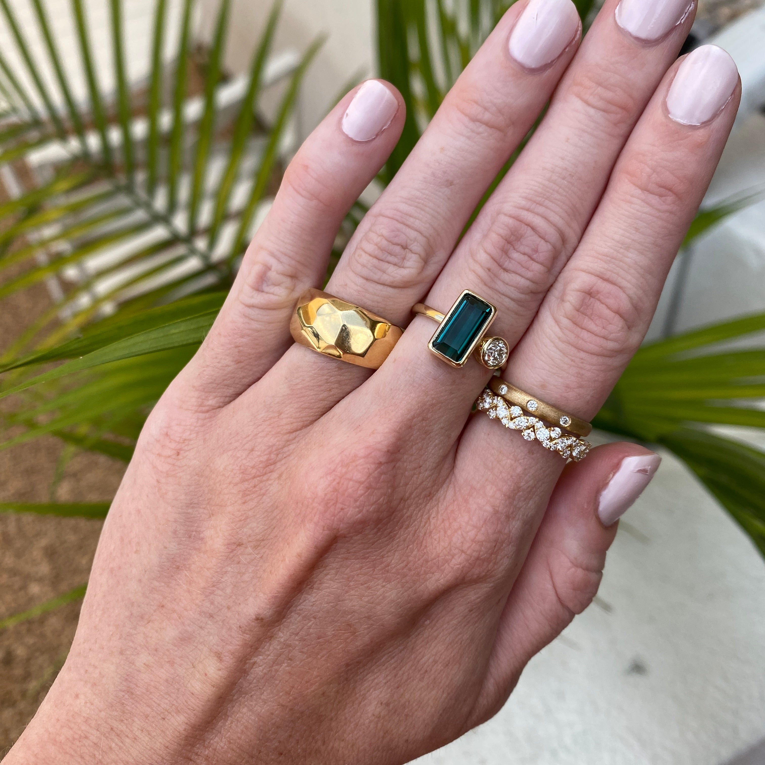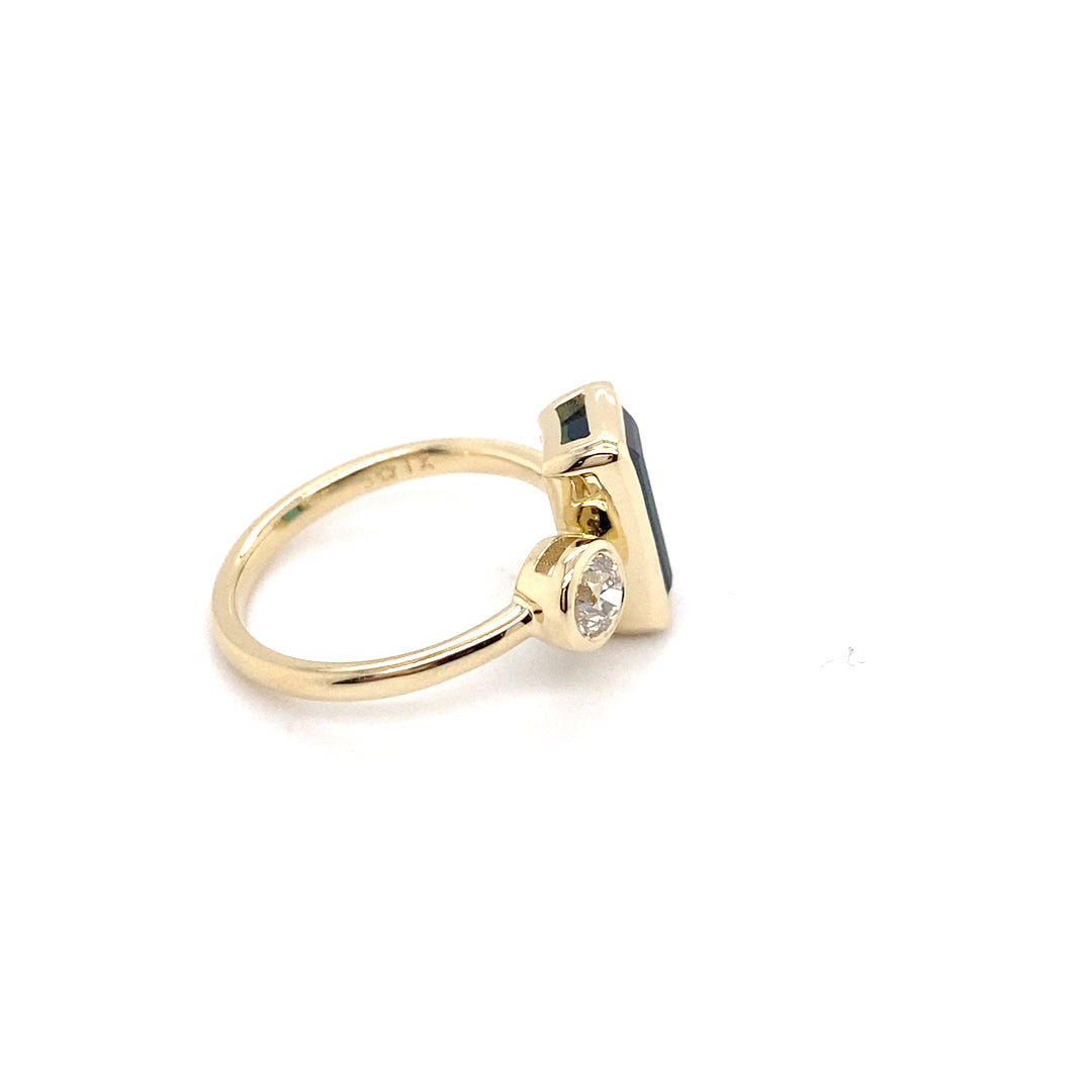 Wear on its own or add a curved ring to make a statement! Tourmalines are making a statement in our Marigold Collection. Featuring a vibrant bezel set 2.14-carat green tourmaline, this ring captures the beauty of nature in its purest form. The green tourmaline is accented with a 0.37 carat Old European Cut diamond, adding just the right touch of brilliance and contrast. The ring is a size 6 and can be sized up or down by 2 sizes.