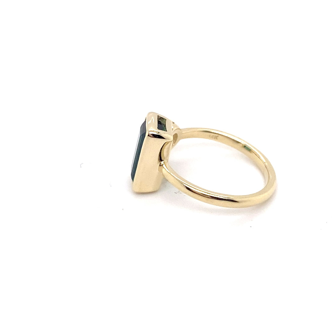 14k Yellow Gold 2.14ct Green Tourmaline and 0.37ct Old European Cut Diamond Bezel Set Ring.