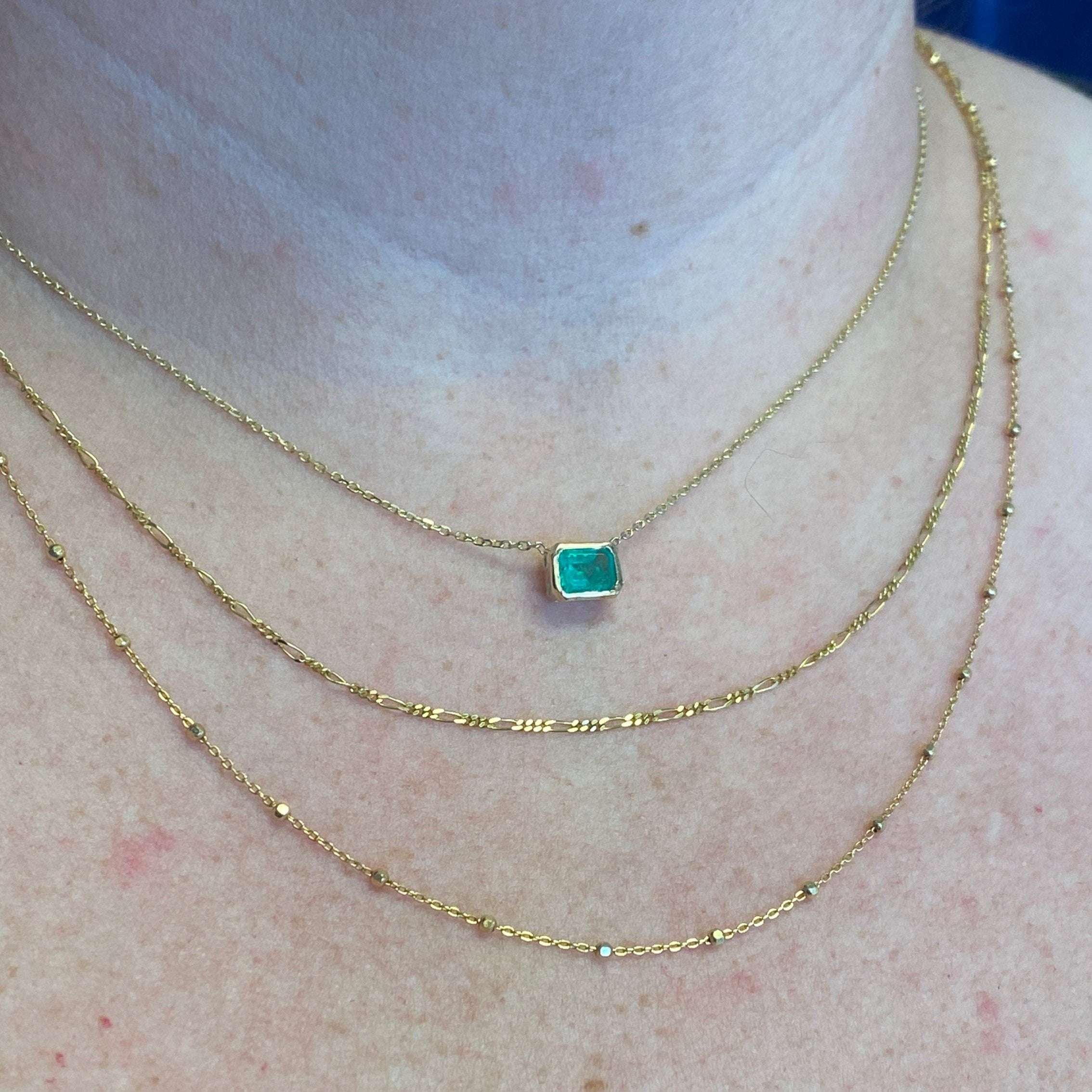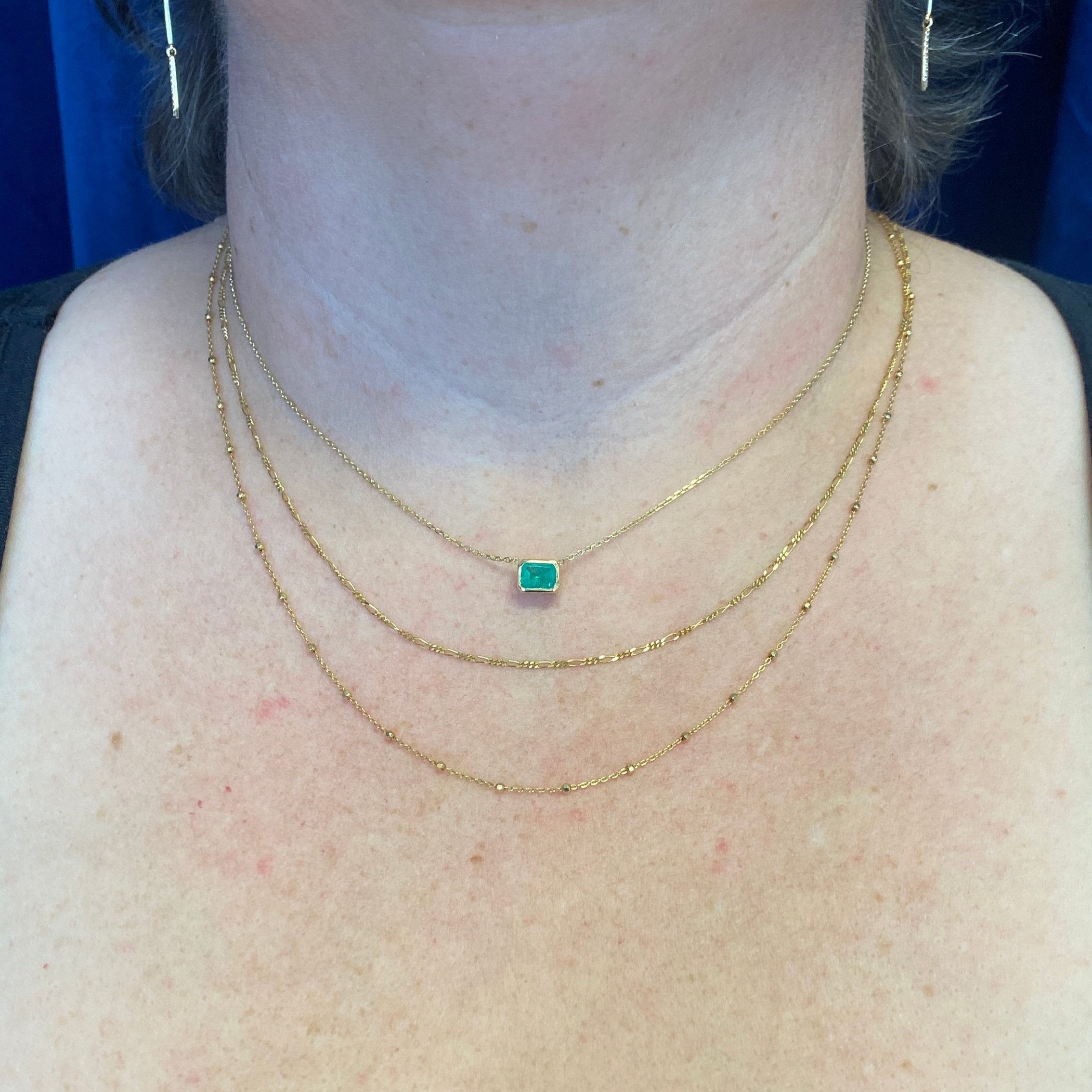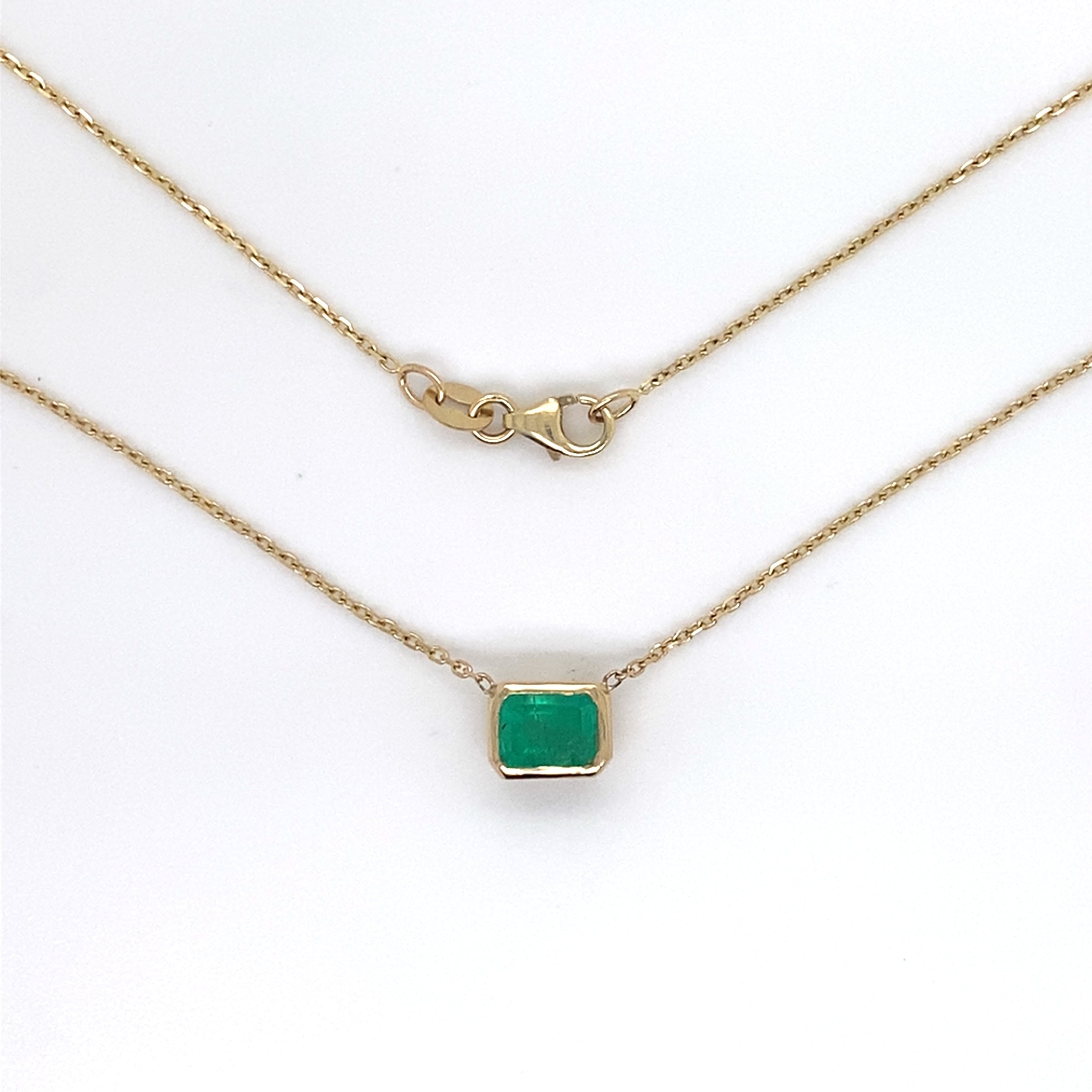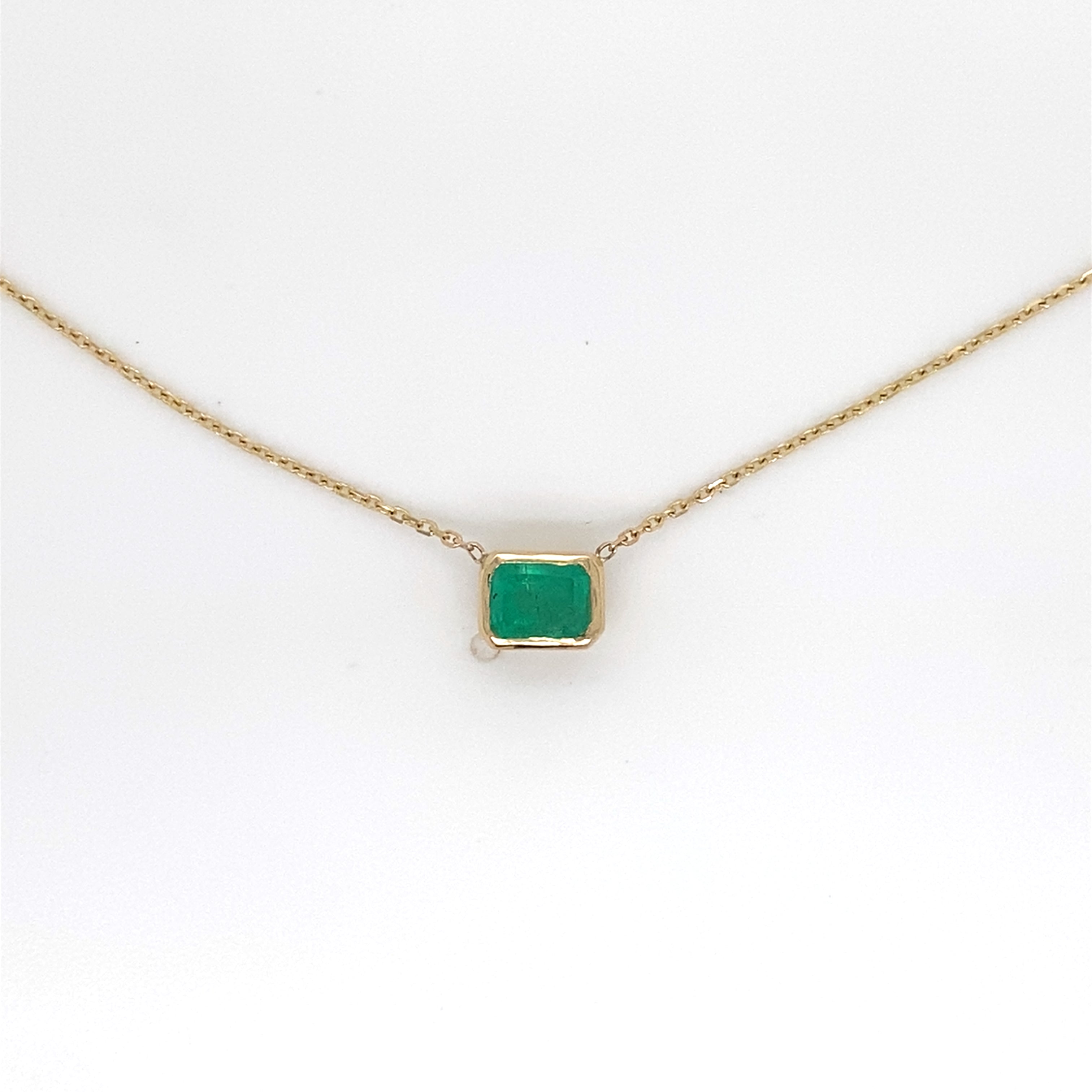 This gorgeous garden green bezel set emerald pendant measures 7.75x6mm and sits centered on a 14k yellow gold 16" cable chain.