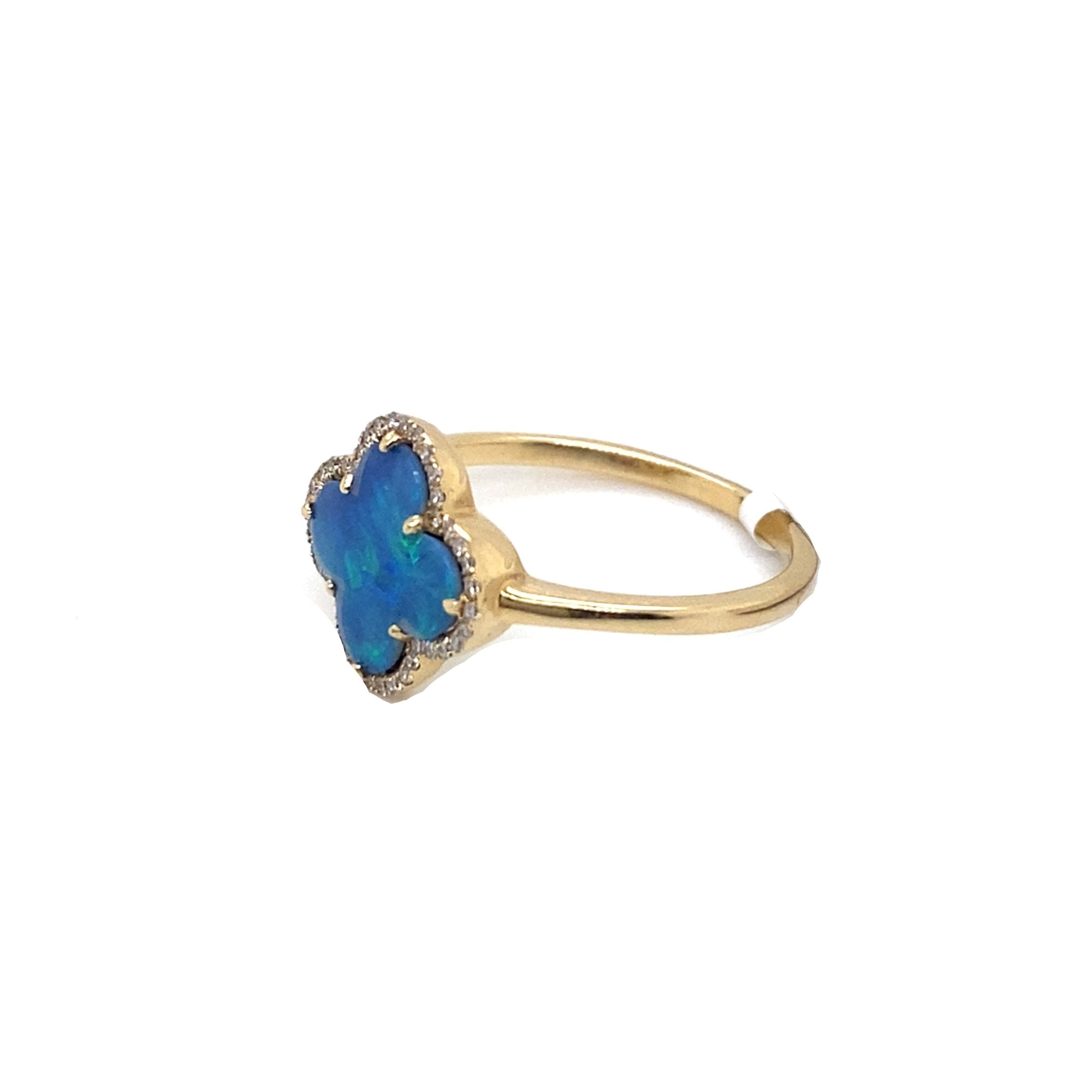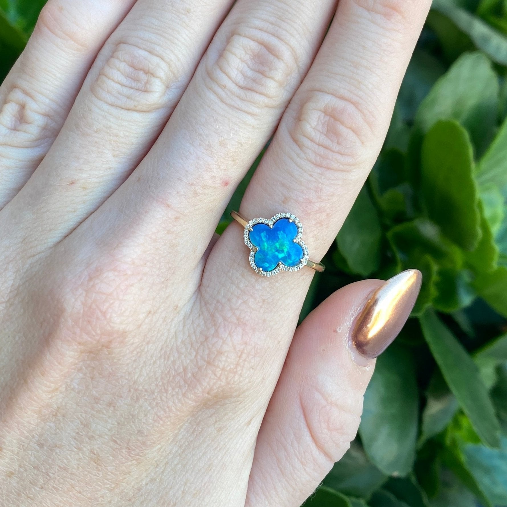 Easily your new favorite ring. This opal has the fire that you've been searching for all year long. With its clover inspired cut and elegant diamond halo, everyone will be asking you about this ring!