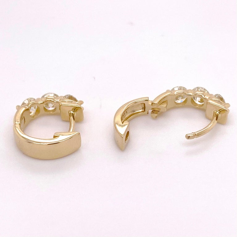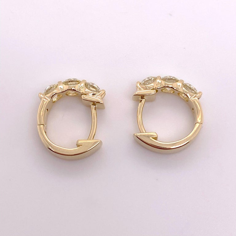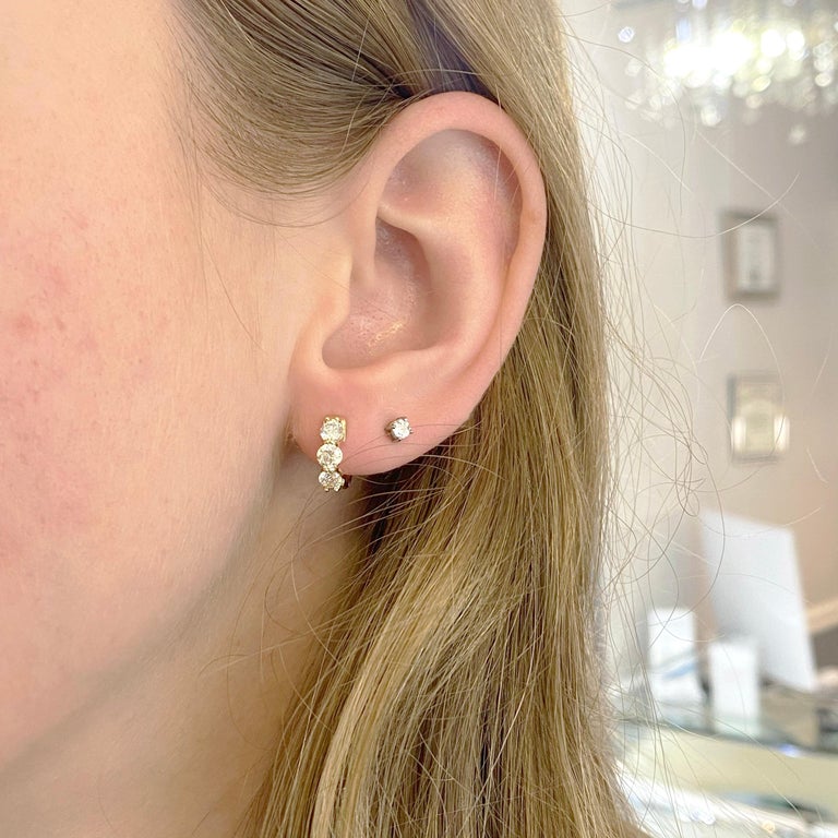 These gorgeous 3 diamond earrings are absolutely stunning! The 1.17 carat total weight diamond earrings have three diamonds on each earring. It is hinged at the bottom so that they are easy to put on and they snap in place. These are great earrings to wear when you are wearing a mask or want to make sure that you earrings stay on! The detailed description is as follows: