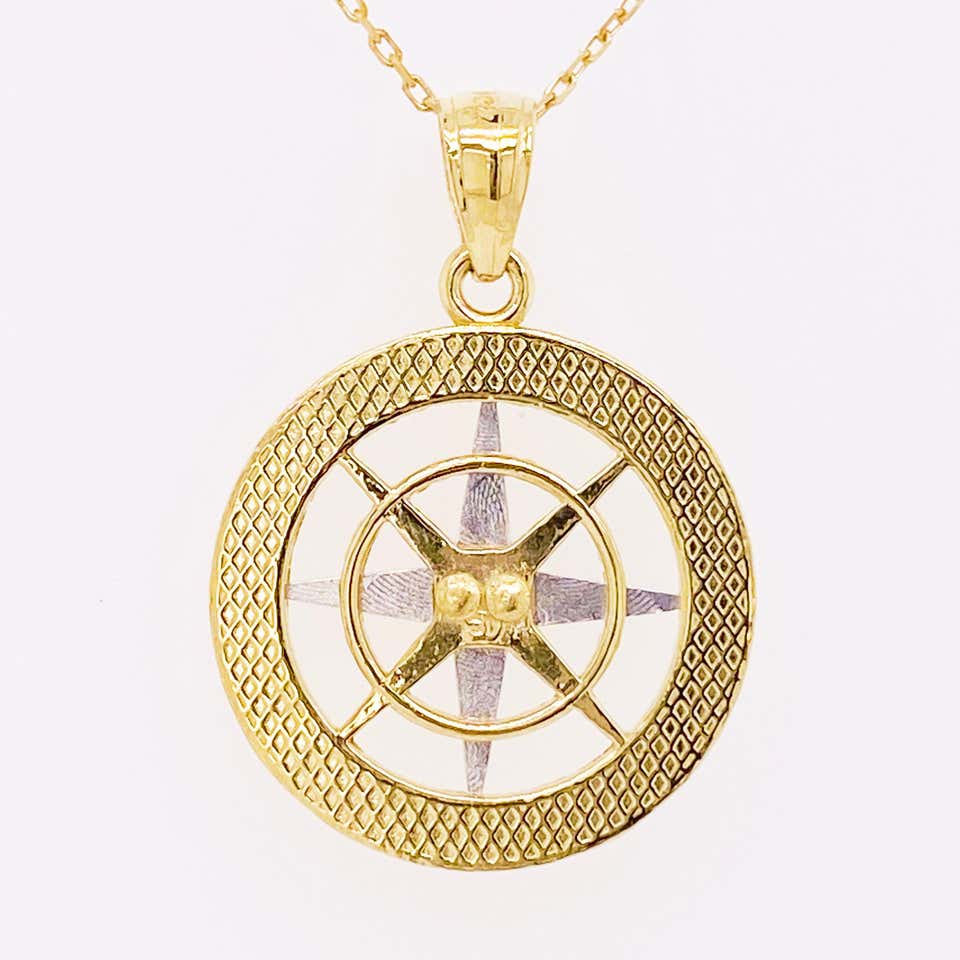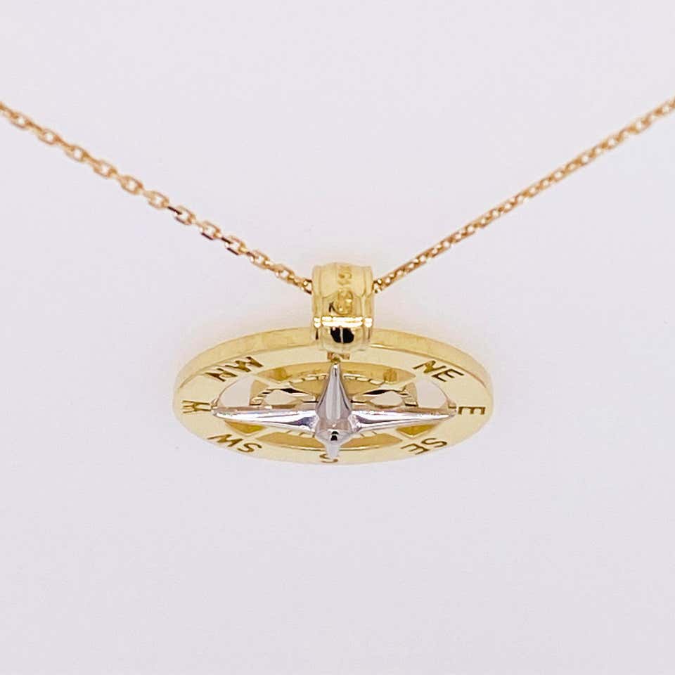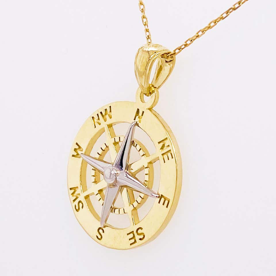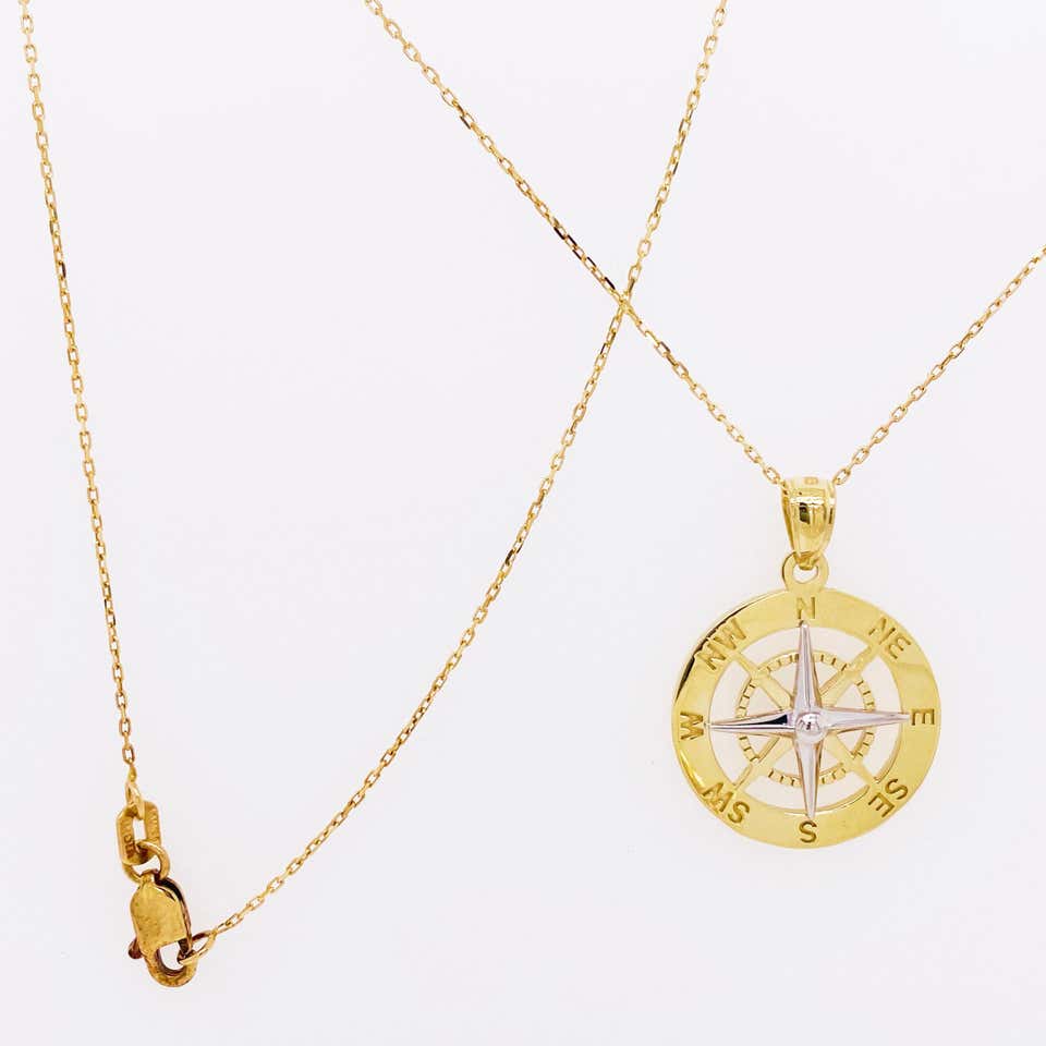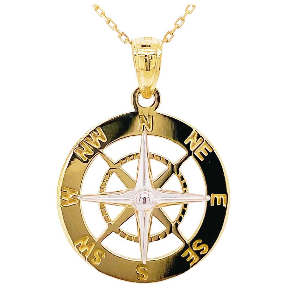 Gold Compass Necklace, 14 Karat Yellow White Gold, Journey to Follow Your Heart